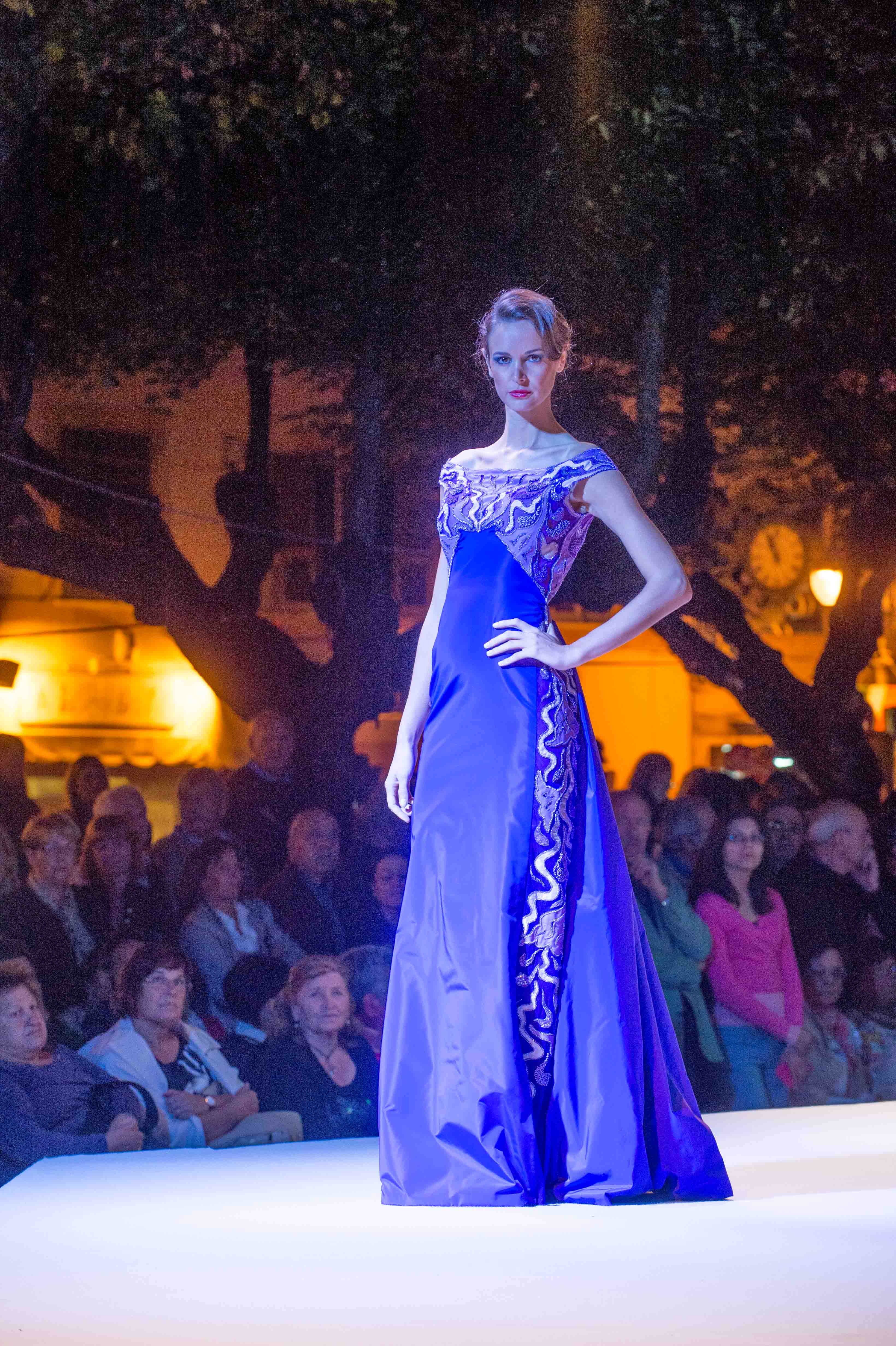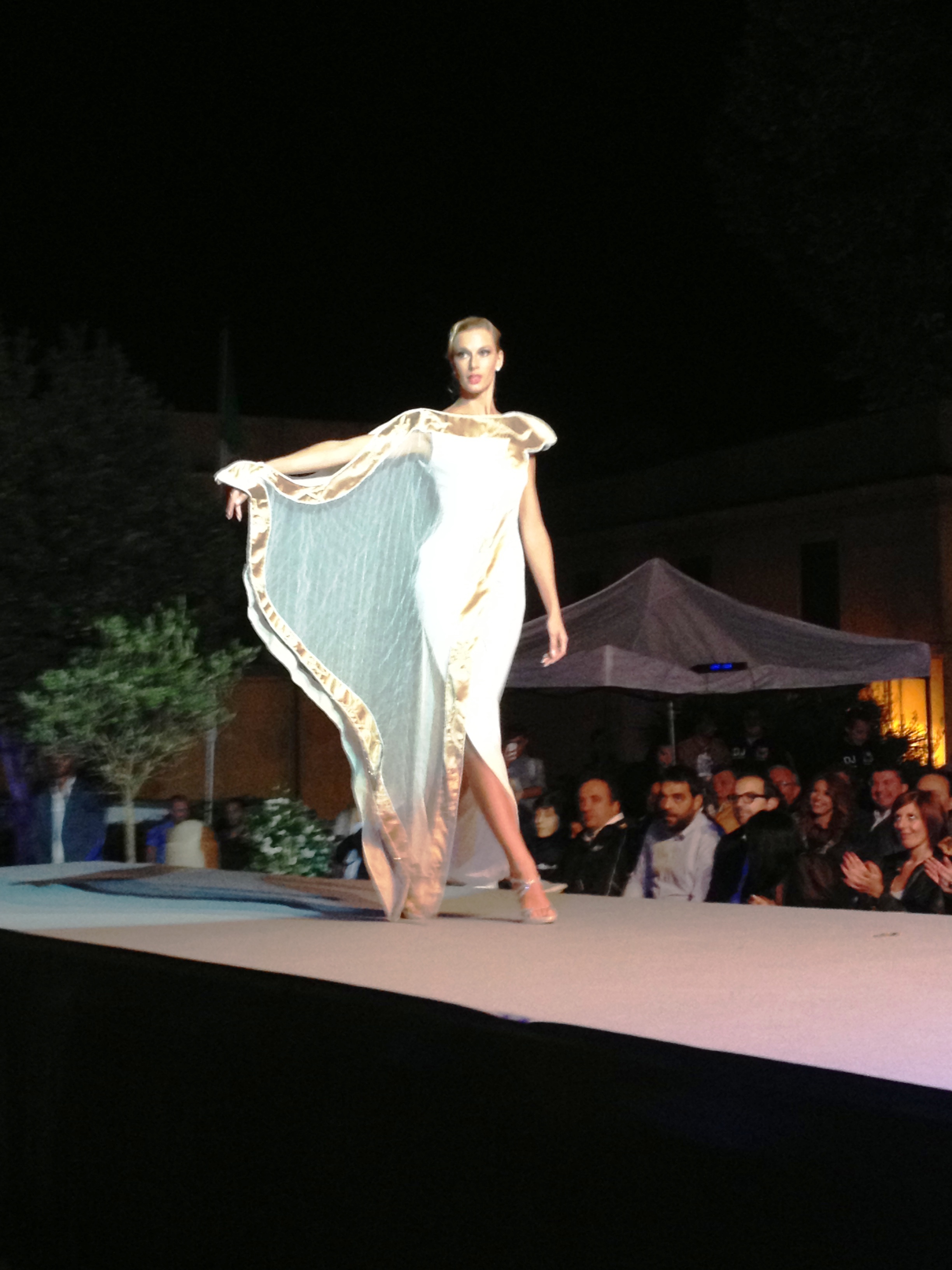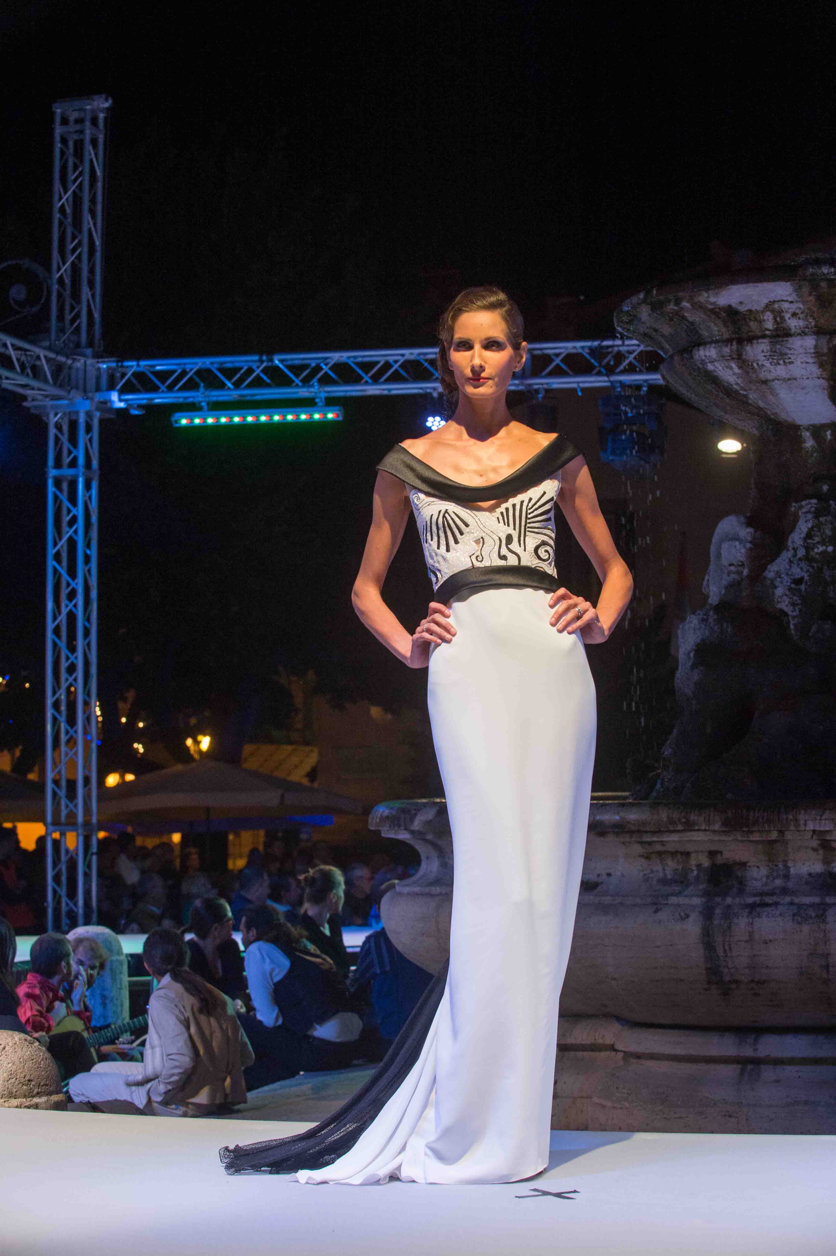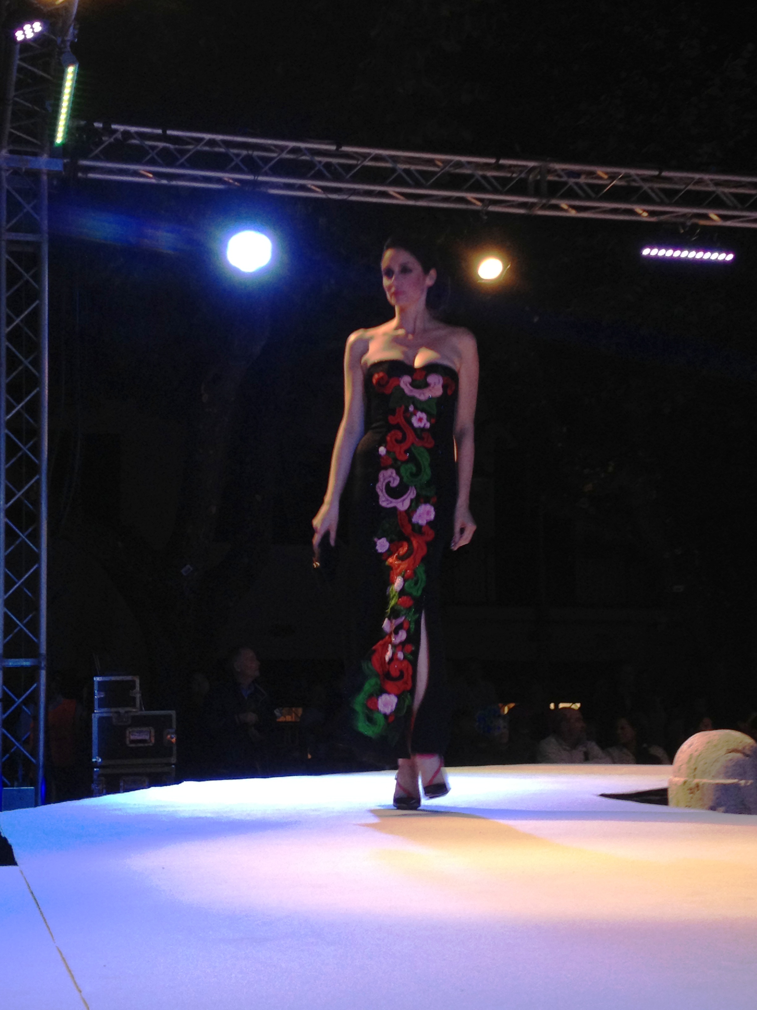 Questa volta ha presentato la sua collezione Musica, visto che essa, come la moda, ha un linguaggio universale in grado di unire le popolazioni di tutto il mondo al di là delle diverse lingue e culture, e dato che la serata era ad essa dedicata. Dei 24 capi portati in passerella fatti di cadiz, crepes, chiffon, georgette, sete stampate e ricami, l’ultimo è stato lo straordinario abito Arpa.