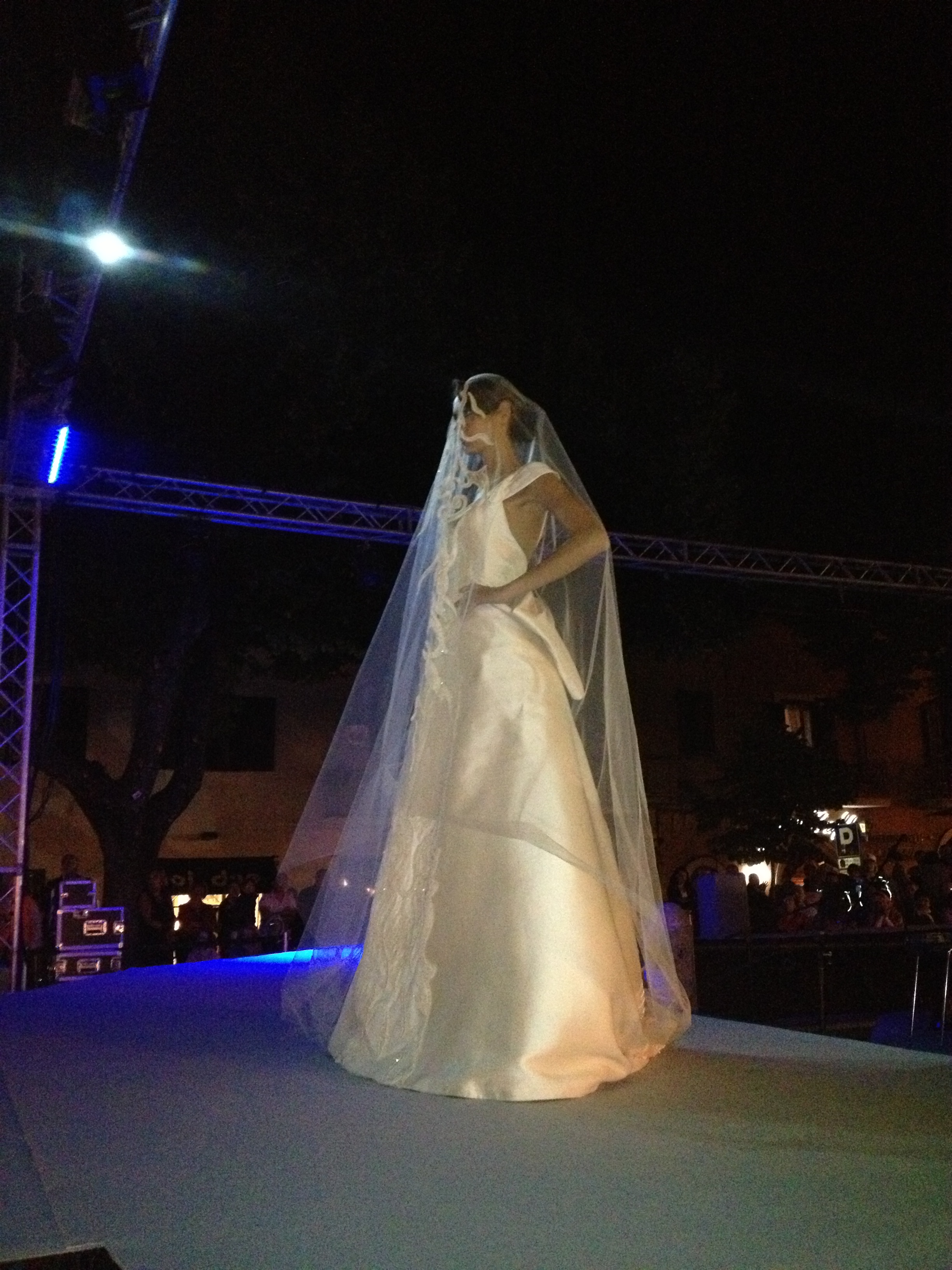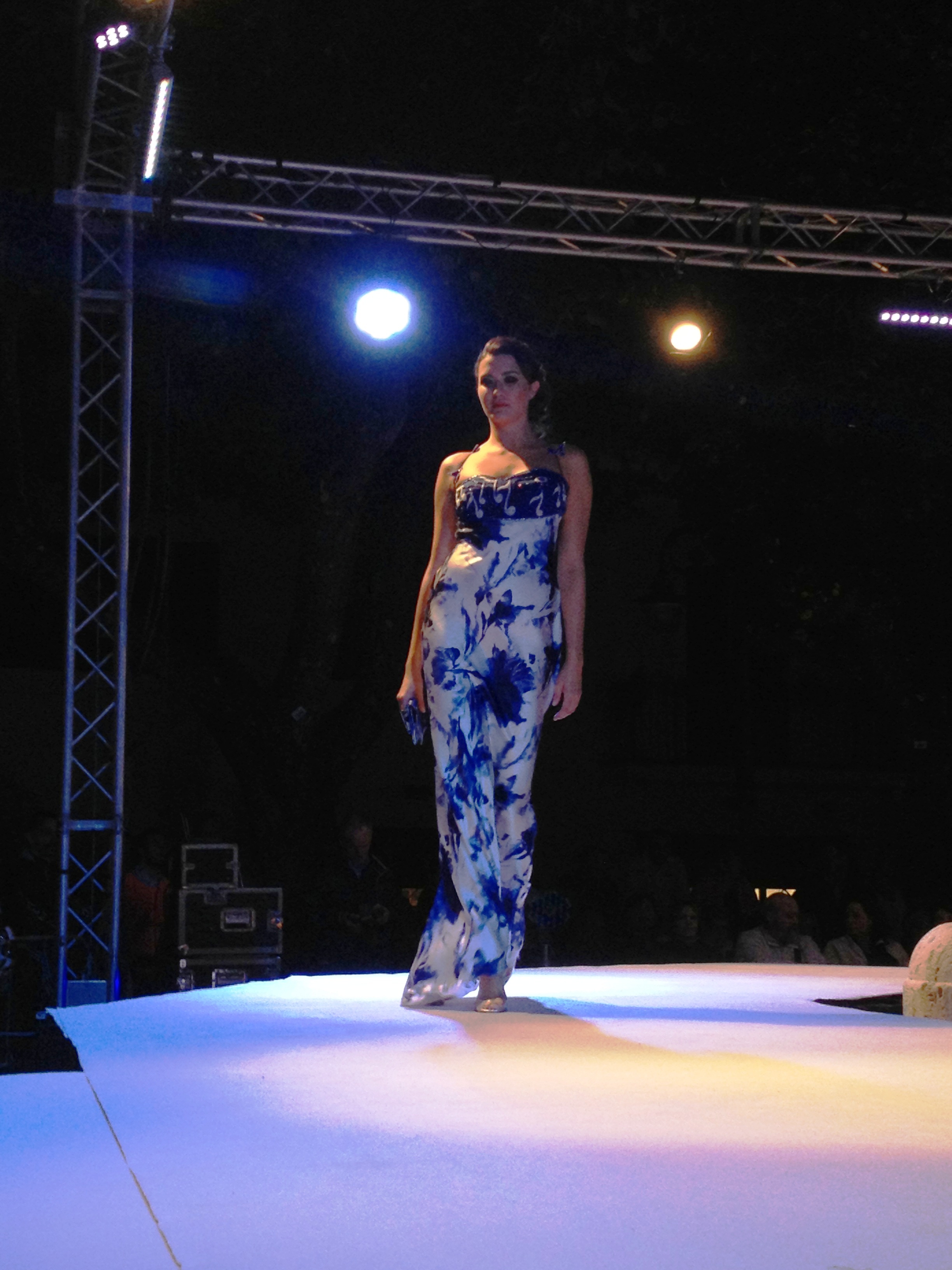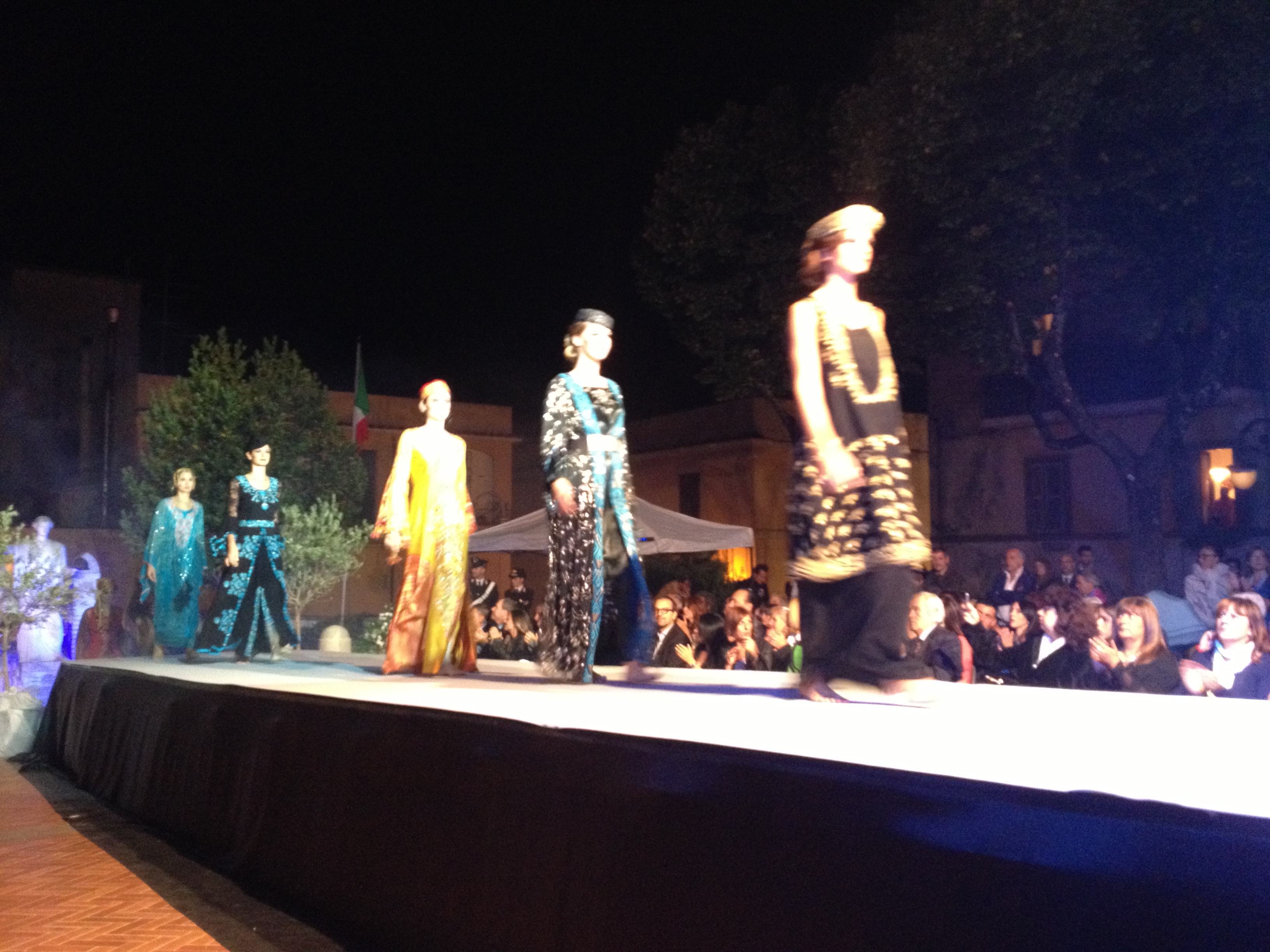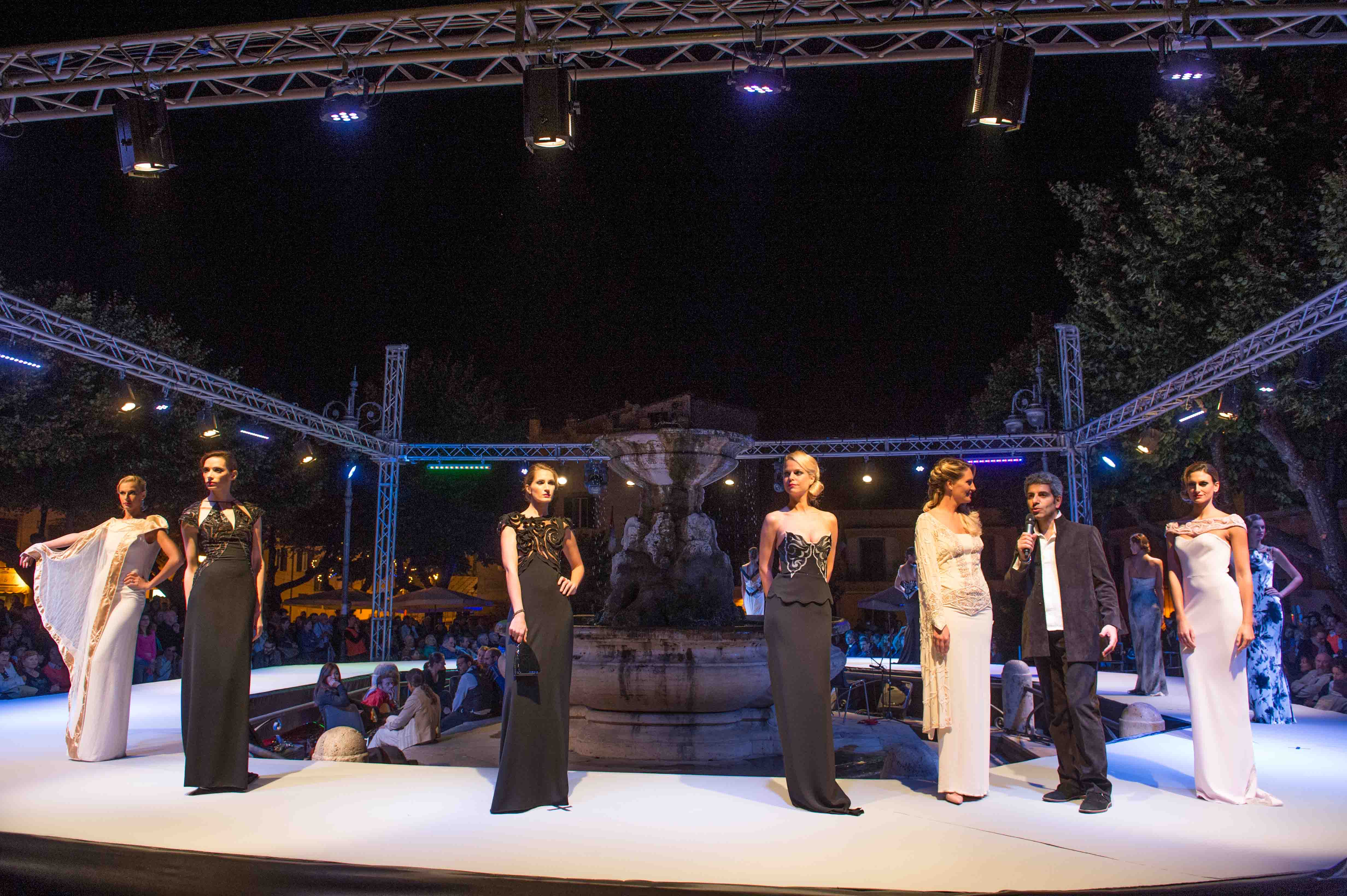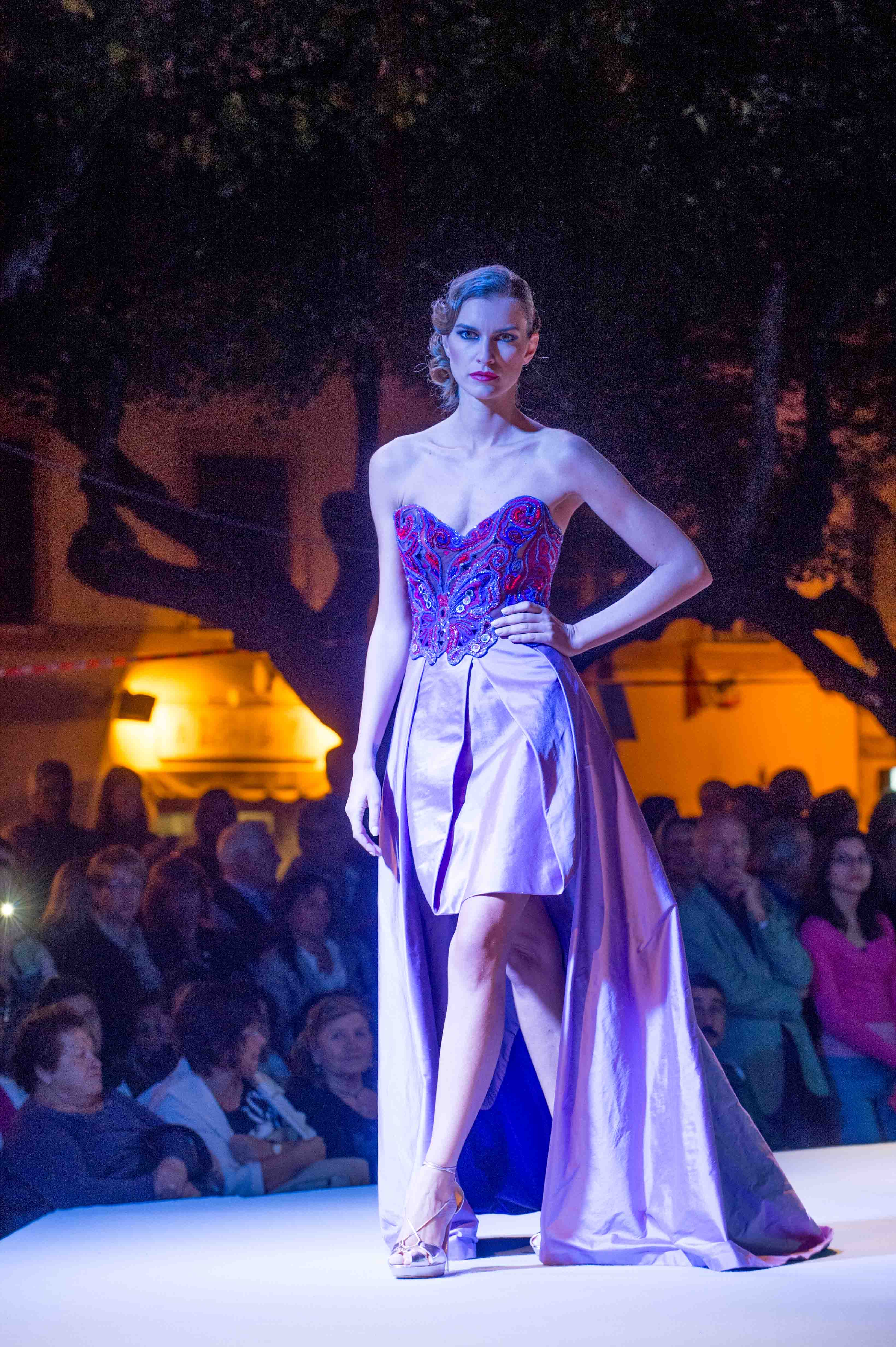 Questa volta ha presentato la sua collezione Musica, visto che essa, come la moda, ha un linguaggio universale in grado di unire le popolazioni di tutto il mondo al di là delle diverse lingue e culture, e dato che la serata era ad essa dedicata. Dei 24 capi portati in passerella fatti di cadiz, crepes, chiffon, georgette, sete stampate e ricami, l’ultimo è stato lo straordinario abito Arpa.
